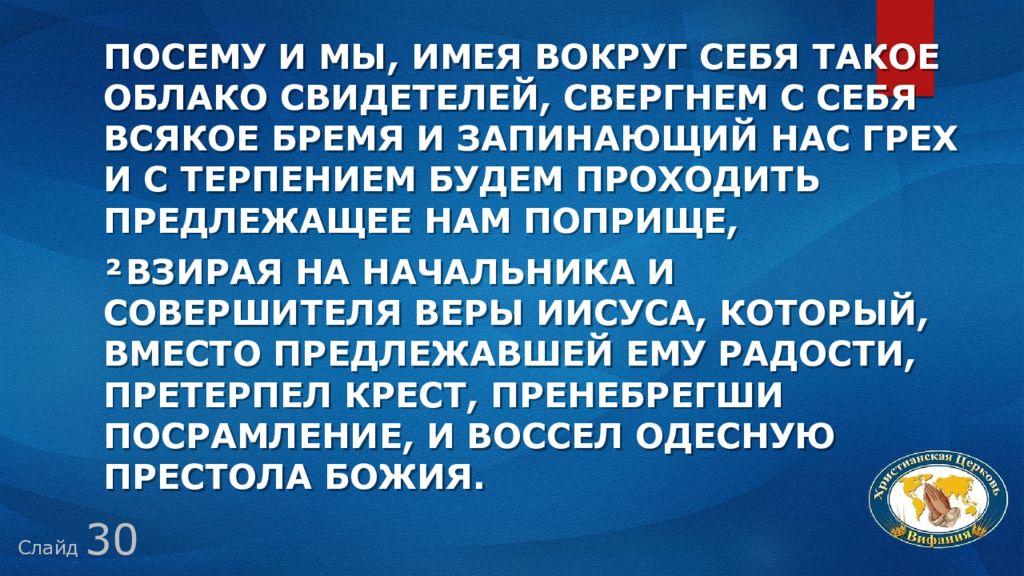 Слайд 30 Посему и мы, имея вокруг себя такое облако свидетелей, свергнем с себя всякое бремя и запинающий нас грех и с терпением будем проходить предлежащее нам поприще, ² взирая на начальника и совершителя веры Иисуса, Который, вместо предлежавшей Ему радости, претерпел крест, пренебрегши посрамление, и воссел одесную престола Божия.