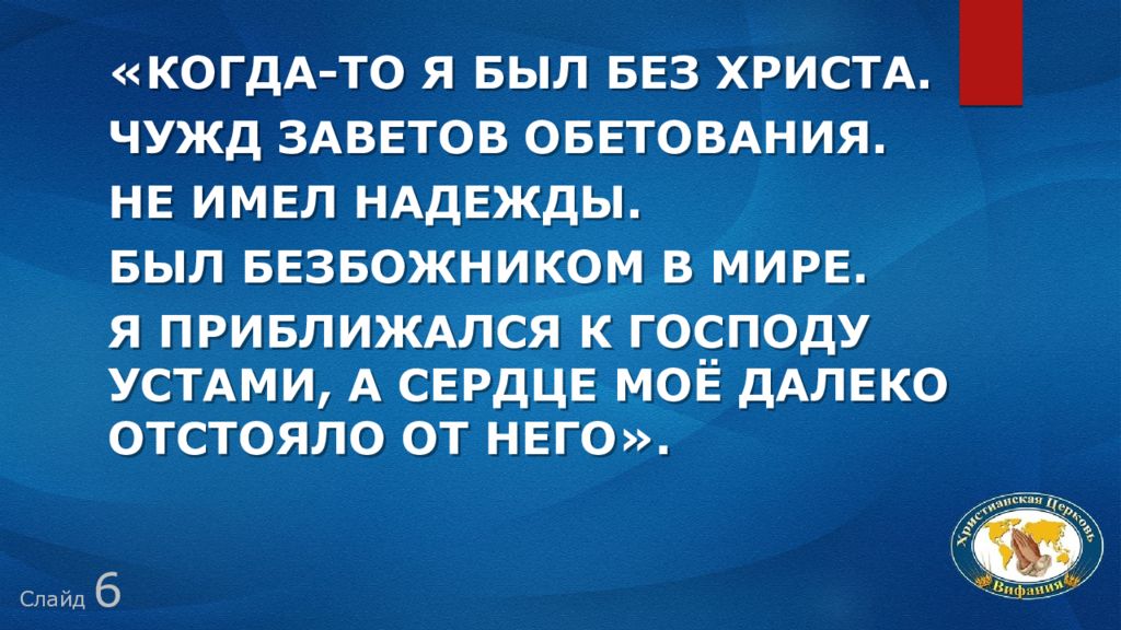 Слайд 6 «Когда-то я был без Христа. Чужд заветов обетования. Не имел надежды. Был безбожником в мире. Я приближался к Господу устами, а сердце моё далеко отстояло от Него».