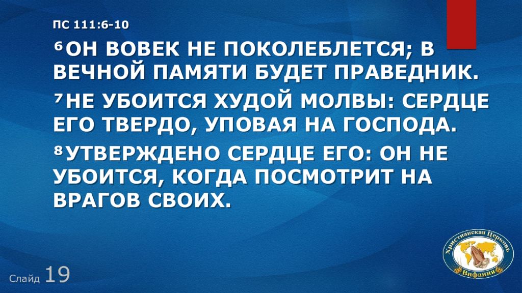 Слайд 19 Пс 111:6-10 ⁶ Он вовек не поколеблется; в вечной памяти будет праведник. ⁷ Не убоится худой молвы: сердце его твердо, уповая на Господа. ⁸ Утверждено сердце его: он не убоится, когда посмотрит на врагов своих.