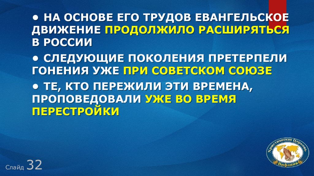 Слайд 3 2 • На основе его трудов евангельское движение продолжило расширяться в России • Следующие поколения претерпели гонения уже при Советском Союзе • Те, кто пережили эти времена, проповедовали уже во время Перестройки