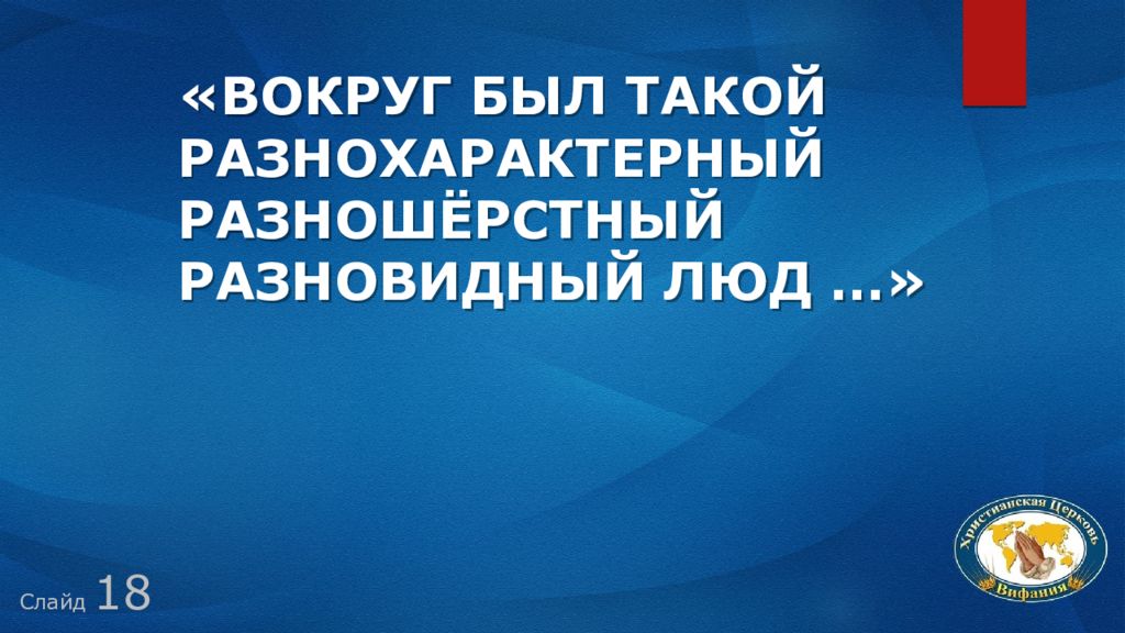 Слайд 18 «Вокруг был такой разнохарактерный разношёрстный разновидный люд …»