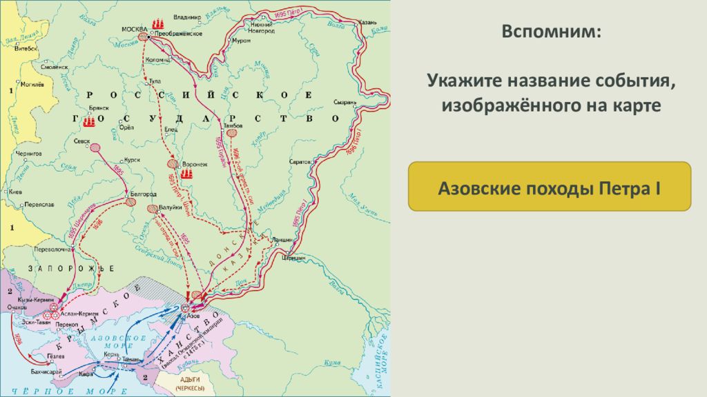 Вспомним: Укажите название события, изображённого на карте Азовские походы Петра I
