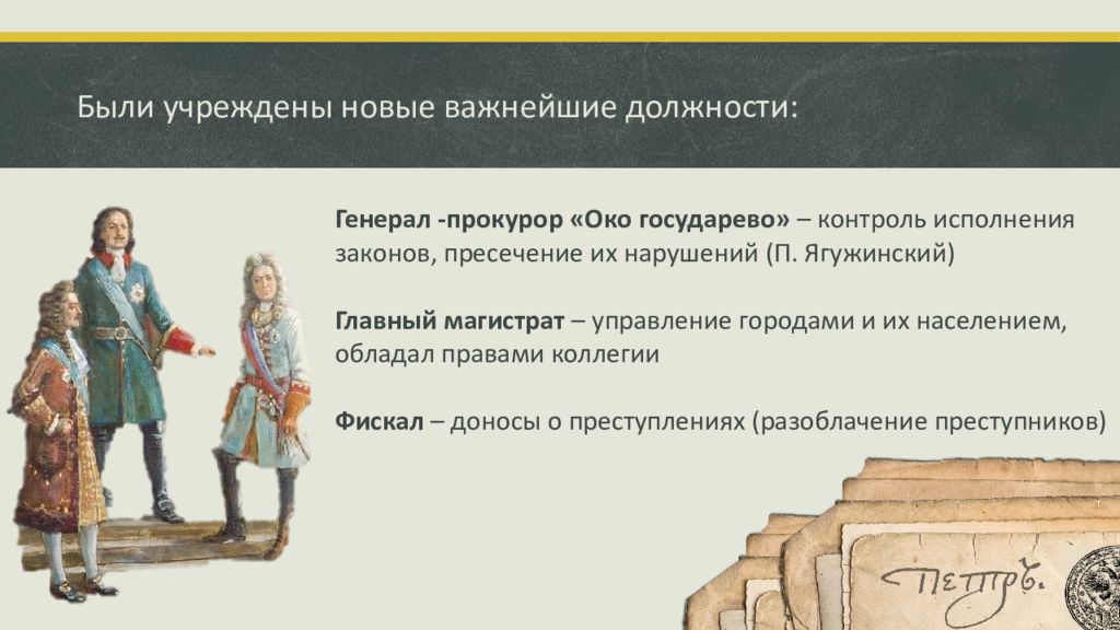 Генерал -прокурор «Око государево» – контроль исполнения законов, пресечение их нарушений (П. Ягужинский) Главный магистрат – управление городами и их населением, обладал правами коллегии Фискал – доносы о преступлениях (разоблачение преступников) На основе стр. 46 определите, какой государственный орган возник с целью защиты власти царя?