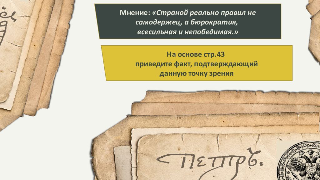 На основе стр.43 приведите факт, подтверждающий данную точку зрения Мнение: «Страной реально правил не самодержец, а бюрократия, всесильная и непобедимая.»