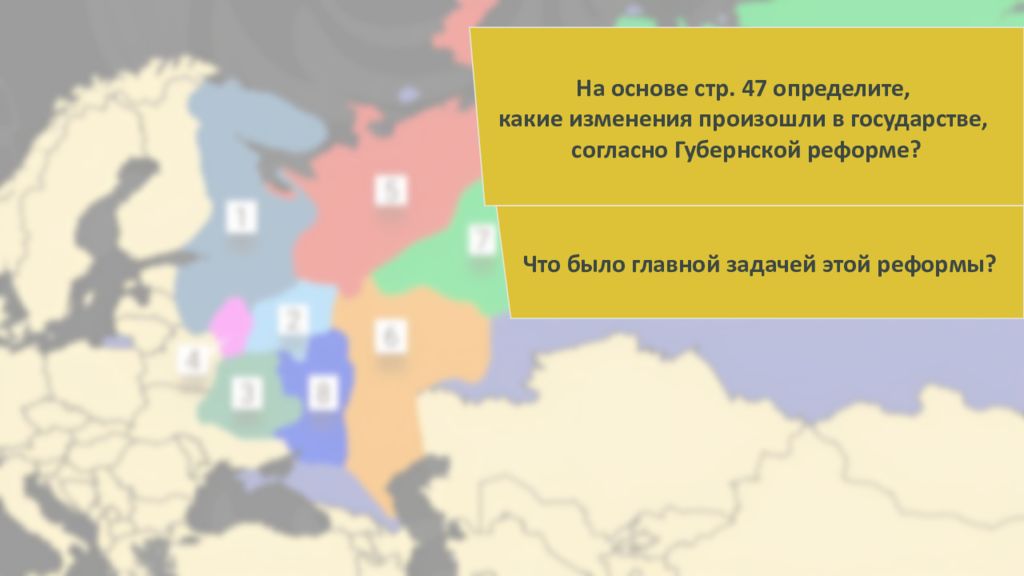 На основе стр. 47 определите, какие изменения произошли в государстве, согласно Губернской реформе? Что было главной задачей этой реформы?