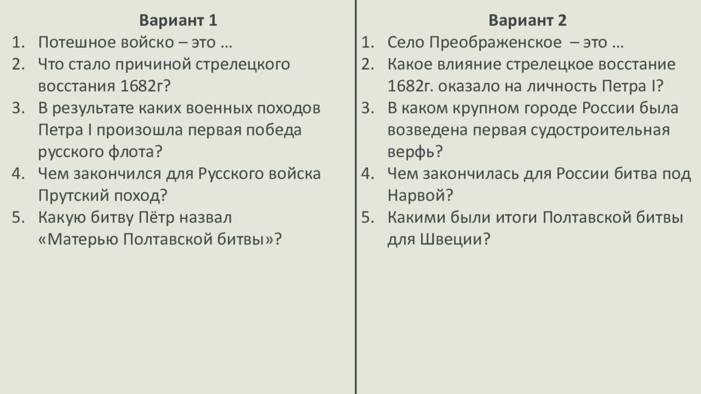 Вариант 1 Потешное войско – это … Что стало причиной стрелецкого восстания 1682г? В результате каких военных походов Петра I произошла первая победа русского флота? Чем закончился для Русского войска Прутский поход? Какую битву Пётр назвал «Матерью Полтавской битвы»? Вариант 2 Село Преображенское – это … Какое влияние стрелецкое восстание 1682г. оказало на личность Петра I ? В каком крупном городе России была возведена первая судостроительная верфь? Чем закончилась для России битва под Нарвой? Какими были итоги Полтавской битвы для Швеции?