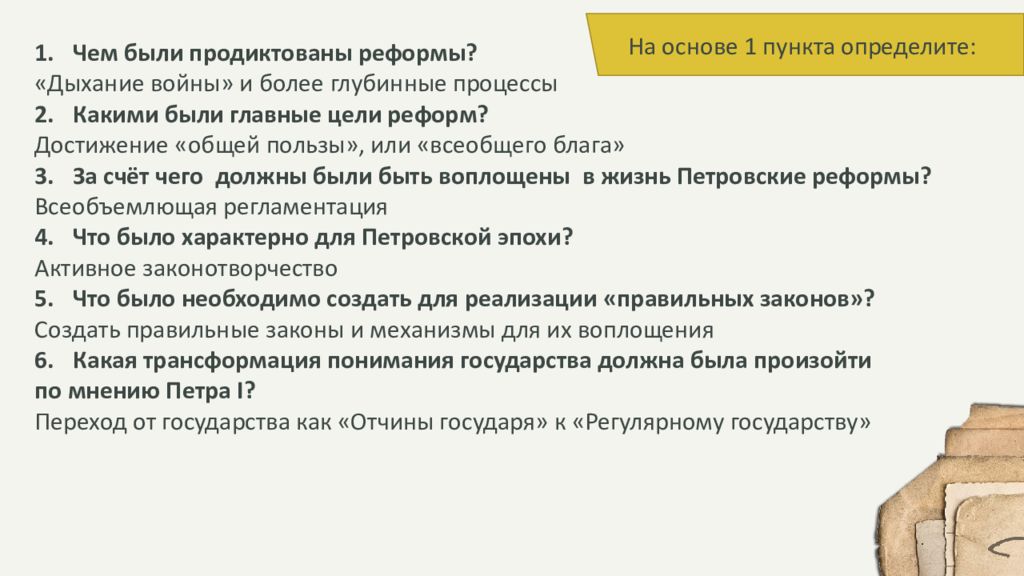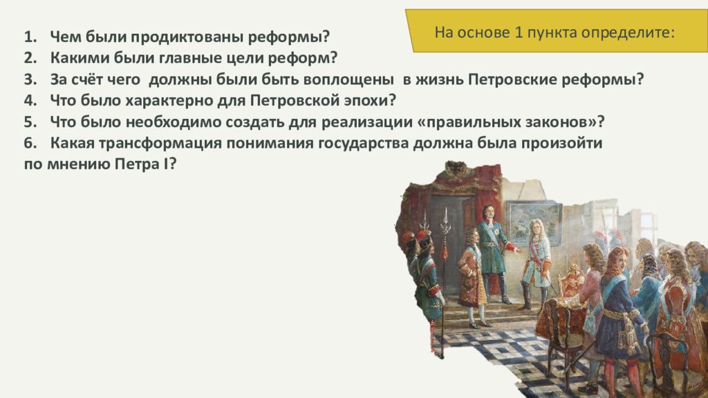 На основе 1 пункта определите: Чем были продиктованы реформы? Какими были главные цели реформ? За счёт чего должны были быть воплощены в жизнь Петровские реформы? Что было характерно для Петровской эпохи? Что было необходимо создать для реализации «правильных законов»? Какая трансформация понимания государства должна была произойти по мнению Петра I ?