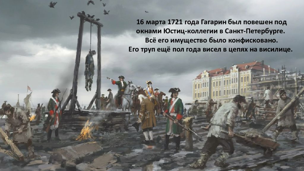 16 марта 1721 года Гагарин был повешен под окнами Юстиц-коллегии в Санкт-Петербурге. Всё его имущество было конфисковано. Его труп ещё пол года висел в цепях на висилице.