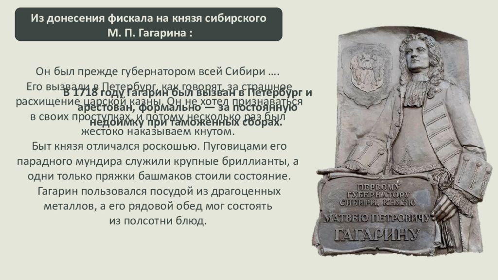 Из донесения фискала на князя сибирского М. П. Гагарина : Он был прежде губернатором всей Сибири …. Его вызвали в Петербург, как говорят, за страшное расхищение царской казны. Он не хотел признаваться в своих проступках, и потому несколько раз был жестоко наказываем кнутом. Быт князя отличался роскошью. Пуговицами его парадного мундира служили крупные бриллианты, а одни только пряжки башмаков стоили состояние. Гагарин пользовался посудой из драгоценных металлов, а его рядовой обед мог состоять из полсотни блюд. В 1718 году Гагарин был вызван в Петербург и арестован, формально — за постоянную недоимку при таможенных сборах.