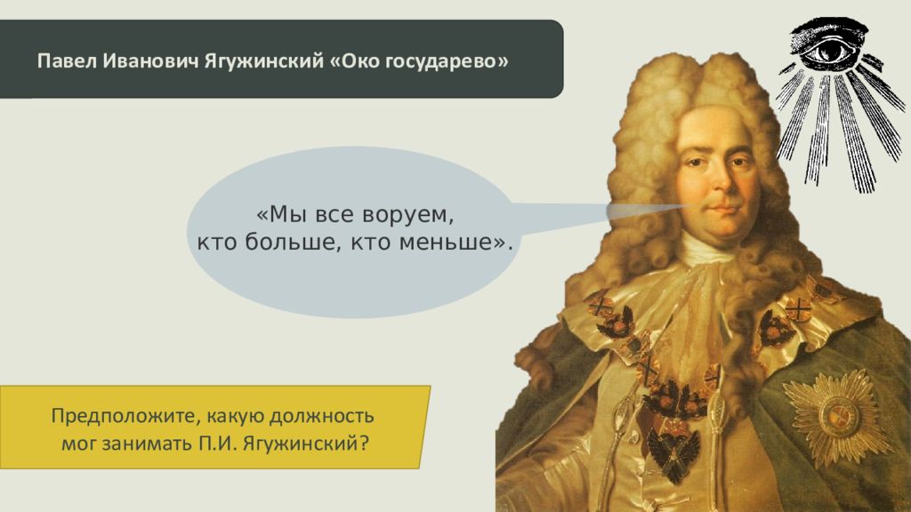 Павел Иванович Ягужинский «Око государево» «Мы все воруем, кто больше, кто меньше». Предположите, какую должность мог занимать П.И. Ягужинский?