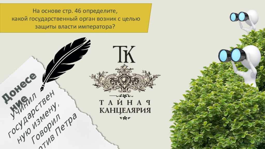 На основе стр. 46 определите, какой государственный орган возник с целью защиты власти императора? Донесение Учинил государственную измену, Говорил против Петра