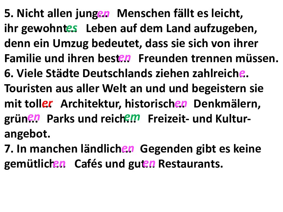 5. Nicht allen jung... Menschen fällt es leicht, ihr gewohnt... Leben auf dem Land aufzugeben, denn ein Umzug bedeutet, dass sie sich von ihrer Familie und ihren best... Freunden trennen müssen. 6. Viele Städte Deutschlands ziehen zahlreich... Touristen aus aller Welt an und und begeistern sie mit toll... Architektur, historisch... Denkmälern, grün... Parks und reich... Freizeit- und Kultur- angebot. 7. In manchen ländlich... Gegenden gibt es keine gemütlich... Cafés und gut... Restaurants. en es en e er en en em en en en