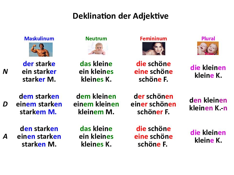 Maskulinum Neutrum Femininum Plural N der stark e ein stark er stark er M. das klein e ein klein es klein es K. die schön e eine schön e schön e F. die klein en klein e K. D d em stark en ein em stark en stark em M. d em klein en ein em klein en klein em M. d er schön en ein er schön en schön er F. d en klein en klein en K.- n A d en stark en ein en stark en stark en M. das klein e ein klein es klein es K. die schön e eine schön e schön e F. die klein en klein e K. Deklination der Adjektive