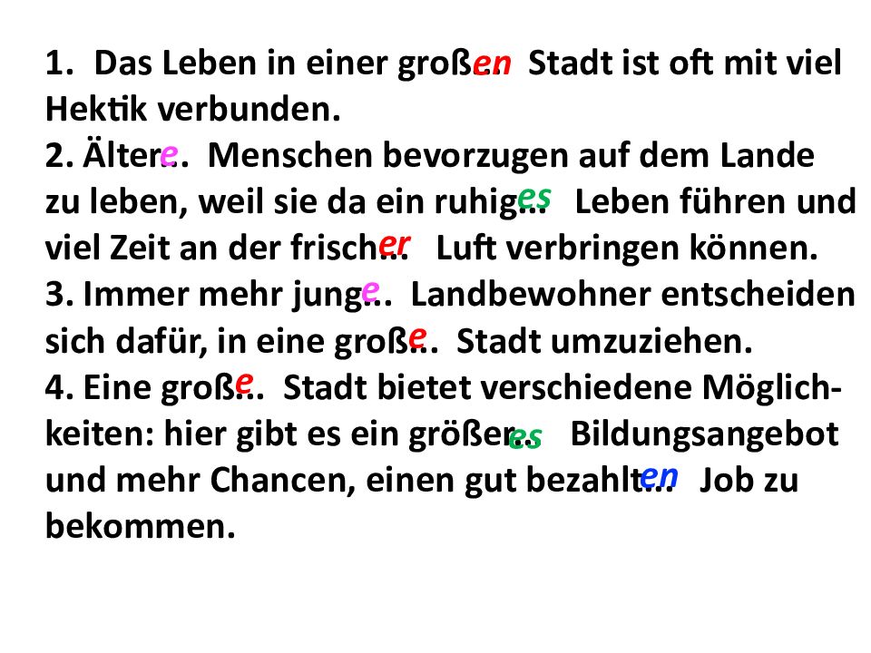Das Leben in einer groß... Stadt ist oft mit viel Hektik verbunden. 2. Älter... Menschen bevorzugen auf dem Lande zu leben, weil sie da ein ruhig... Leben führen und viel Zeit an der frisch... Luft verbringen können. 3. Immer mehr jung... Landbewohner entscheiden sich dafür, in eine groß... Stadt umzuziehen. 4. Eine groß... Stadt bietet verschiedene Möglich- keiten : hier gibt es ein größer... Bildungsangebot und mehr Chancen, einen gut bezahlt... Job zu bekommen. en e es er e e e es en