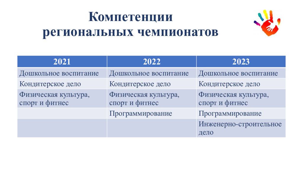 2021 2022 2023 Дошкольное воспитание Дошкольное воспитание Дошкольное воспитание Кондитерское дело Кондитерское дело Кондитерское дело Физическая культура, спорт и фитнес Физическая культура, спорт и фитнес Физическая культура, спорт и фитнес Программирование Программирование Инженерно-строительное дело Компетенции региональных чемпионатов