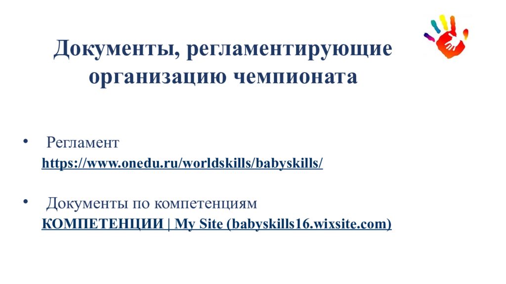 Регламент https://www.onedu.ru/worldskills/babyskills/ Документы по компетенциям КОМПЕТЕНЦИИ | My Site (babyskills16.wixsite.com) Документы, регламентирующие организацию чемпионата
