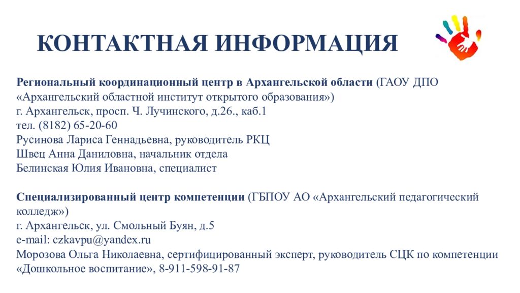 Региональный координационный центр в Архангельской области (ГАОУ ДПО «Архангельский областной институт открытого образования») г. Архангельск, просп. Ч. Лучинского, д.26., каб.1 тел. (8182) 65-20-60 Русинова Лариса Геннадьевна, руководитель РКЦ Швец Анна Даниловна, начальник отдела Белинская Юлия Ивановна, специалист Специализированный центр компетенции (ГБПОУ АО «Архангельский педагогический колледж») г. Архангельск, ул. Смольный Буян, д.5 e-mail : czkavpu@yandex.ru Морозова Ольга Николаевна, сертифицированный эксперт, руководитель СЦК по компетенции «Дошкольное воспитание», 8-911-598-91-87 КОНТАКТНАЯ ИНФОРМАЦИЯ