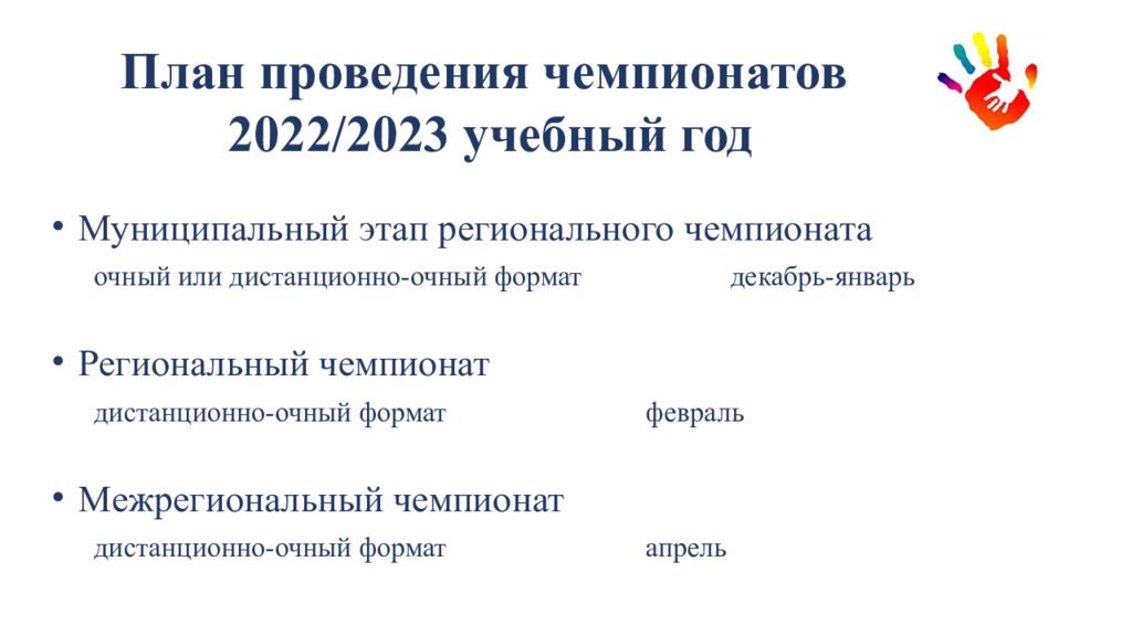 Муниципальный этап регионального чемпионата очный или дистанционно-очный формат декабрь-январь Региональный чемпионат дистанционно-очный формат февраль Межрегиональный чемпионат дистанционно-очный формат апрель План проведения чемпионатов 2022/2023 учебный год