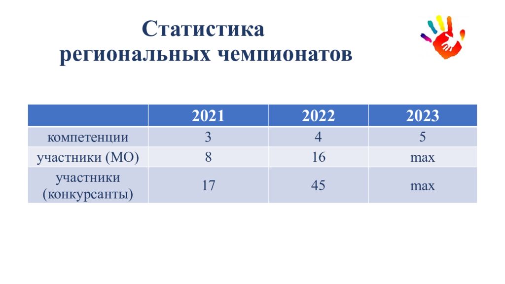 2021 2022 2023 компетенции 3 4 5 участники (МО) 8 16 max участники (конкурсанты) 17 45 max
