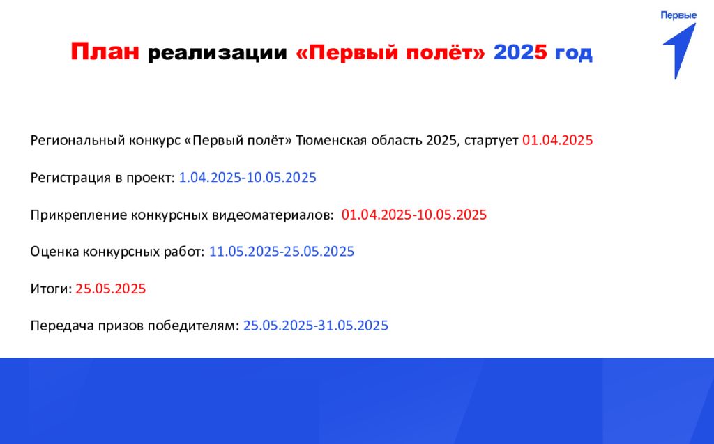 План реализации «Первый полёт» 202 5 год Региональный конкурс «Первый полёт» Тюменская область 2025, стартует 01.04.2025 Регистрация в проект: 1.04.2025-10.05.2025 Прикрепление конкурсных видеоматериалов: 01.04.2025-10.05.2025 Оценка конкурсных работ: 11.05.2025-25.05.2025 Итоги: 25.05.2025 Передача призов победителям: 25.05.2025-31.05.2025