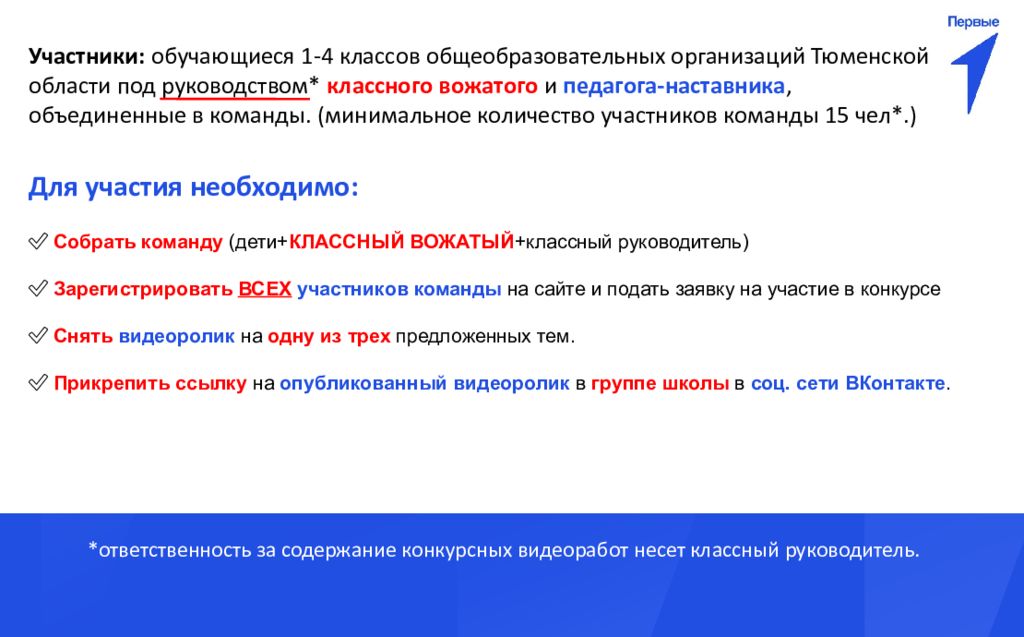 Участники: обучающиеся 1-4 классов общеобразовательных организаций Тюменской области под руководством* классного вожатого и педагога-наставника, объединенные в команды. (минимальное количество участников команды 15 чел*.) *ответственность за содержание конкурсных видеоработ несет классный руководитель. Для участия необходимо: ✅ Собрать команду ( дети+ КЛАССНЫЙ ВОЖАТЫЙ +классный руководитель) ✅ Зарегистрировать ВСЕХ участников команды на сайте и подать заявку на участие в конкурсе ✅ Снять видеоролик на одну из трех предложенных тем. ✅ Прикрепить ссылку на опубликованный видеоролик в группе школы в соц. сети ВКонтакте.
