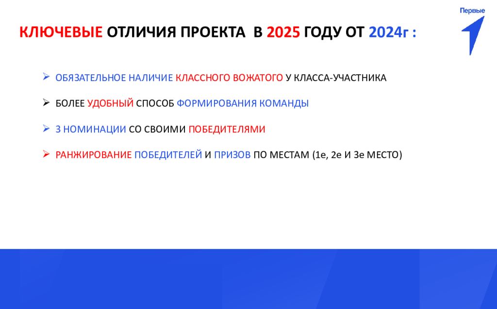 КЛЮЧЕВЫЕ ОТЛИЧИЯ ПРОЕКТА В 2025 ГОДУ ОТ 2024г : ОБЯЗАТЕЛЬНОЕ НАЛИЧИЕ КЛАССНОГО ВОЖАТОГО У КЛАССА-УЧАСТНИКА БОЛЕЕ УДОБНЫЙ СПОСОБ ФОРМИРОВАНИЯ КОМАНДЫ 3 НОМИНАЦИИ СО СВОИМИ ПОБЕДИТЕЛЯМИ РАНЖИРОВАНИЕ ПОБЕДИТЕЛЕЙ И ПРИЗОВ ПО МЕСТАМ (1е, 2е И 3е МЕСТО)