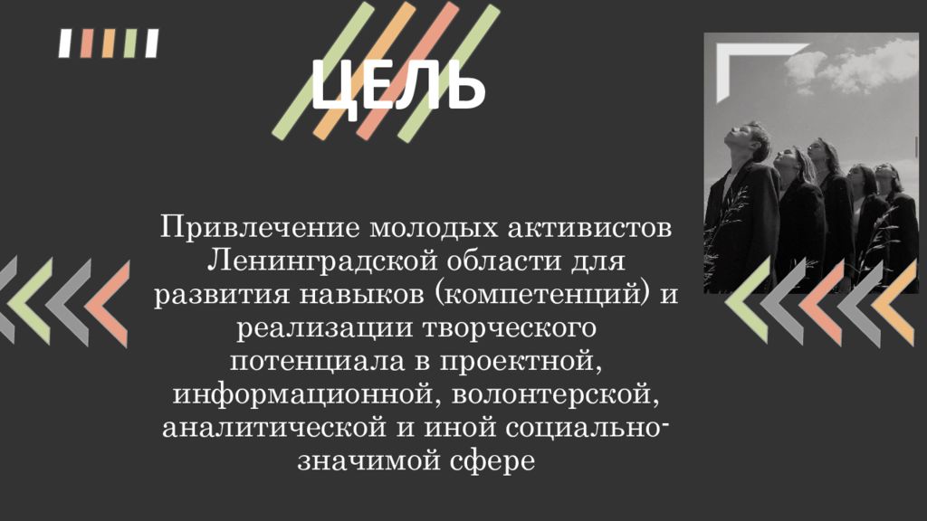 Слайд 2: Привлечение молодых активистов Ленинградской области для развития навыков (компетенций) и реализации творческого потенциала в проектной, информационной, волонтерской, аналитической и иной социально-значимой сфере