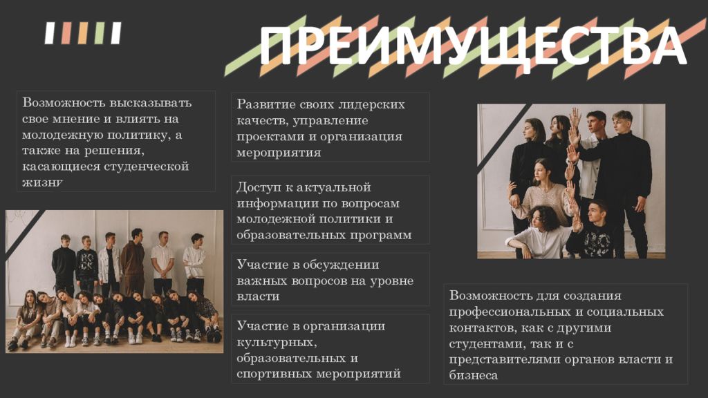 ПРЕИМУЩЕСТВА Возможность в ысказывать свое мнение и влиять на молодежную политику, а также на решения, касающиеся студенческой жизни Развитие своих лидерских качеств, управление проектами и организация мероприятия Возможность для создания профессиональных и социальных контактов, как с другими студентами, так и с представителями органов власти и бизнеса Участие в организации культурных, образовательных и спортивных мероприятий Доступ к актуальной информации по вопросам молодежной политики и образовательных программ У частие в обсуждении важных вопросов на уровне власти