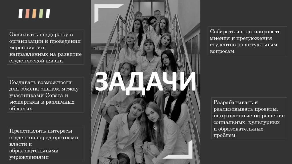 ЗАДАЧИ Собирать и анализировать мнения и предложения студентов по актуальным вопросам Представлять интересы студентов перед органами власти и образовательными учреждениями Разрабатывать и реализовывать проекты, направленные на решение социальных, культурных и образовательных проблем Оказывать поддержку в организации и проведении мероприятий, направленных на развитие студенческой жизни Создавать возможности для обмена опытом между участниками Совета и экспертами в различных областях