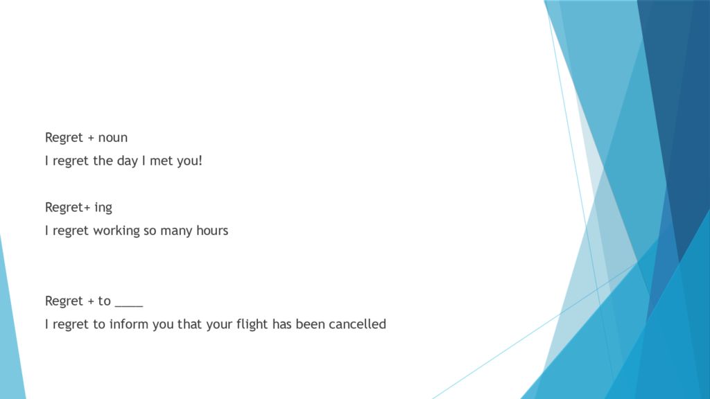 Regret + noun I regret the day I met you! Regret+ ing I regret working so many hours Regret + to ____ I regret to inform you that your flight has been cancelled