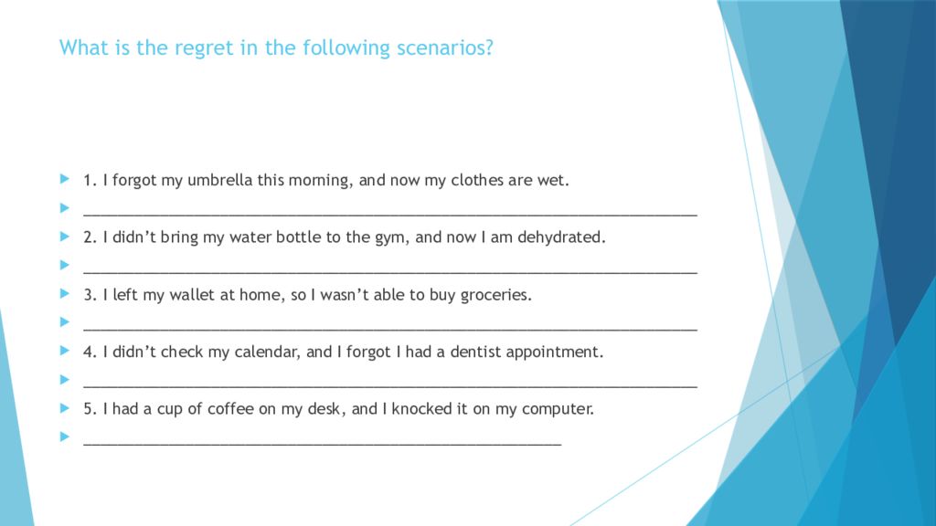 1. I forgot my umbrella this morning, and now my clothes are wet. ________________________________________________________________________ 2. I didn’t bring my water bottle to the gym, and now I am dehydrated. ________________________________________________________________________ 3. I left my wallet at home, so I wasn’t able to buy groceries. ________________________________________________________________________ 4. I didn’t check my calendar, and I forgot I had a dentist appointment. ________________________________________________________________________ 5. I had a cup of coffee on my desk, and I knocked it on my computer. ________________________________________________________