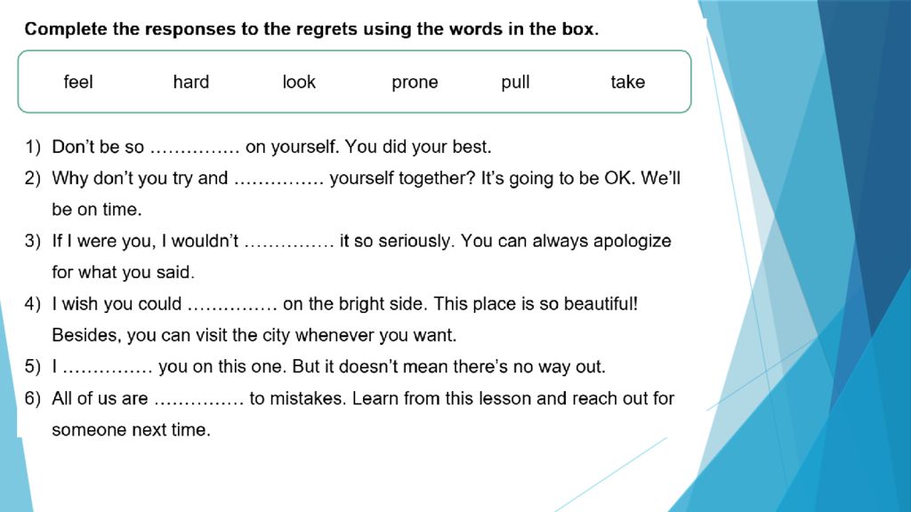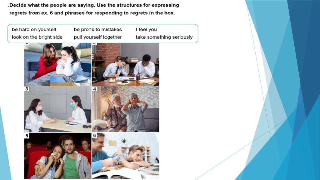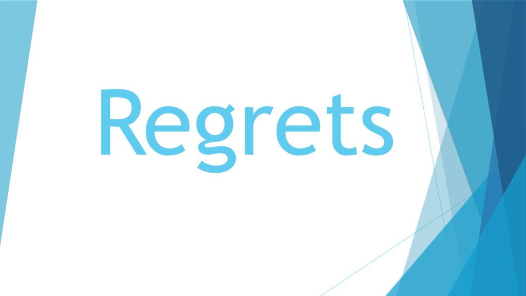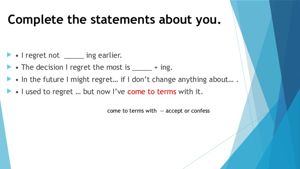 • I regret not _____ ing earlier. • The decision I regret the most is _____ + ing. • In the future I might regret… if I don’t change anything about…. • I used to regret … but now I’ve come to terms with it. Complete the statements about you. come to terms with -- accept or confess