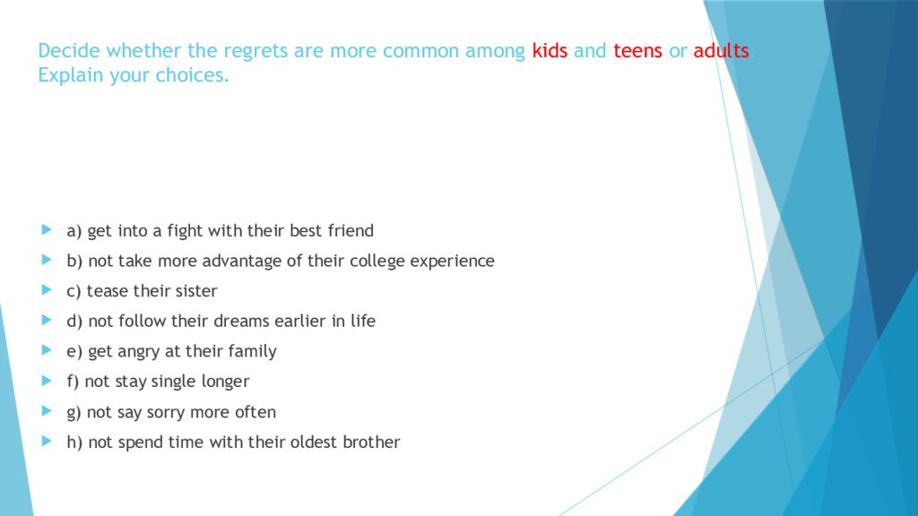 Слайд 8: Decide whether the regrets are more common among kids and teens or adults. Explain your choices