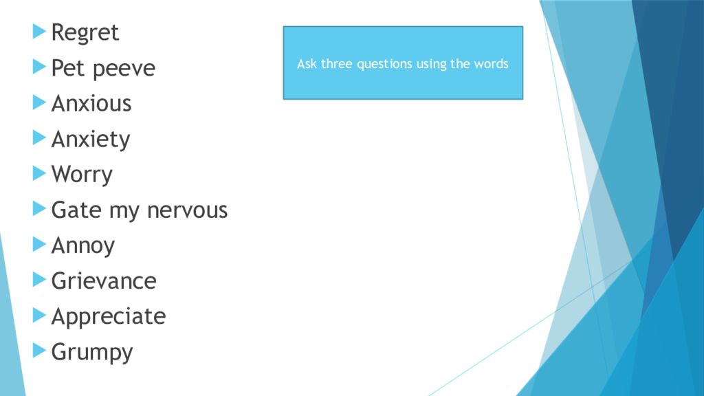 Regret Pet peeve Anxious Anxiety Worry Gate my nervous Annoy Grievance Appreciate Grumpy Ask three questions using the words