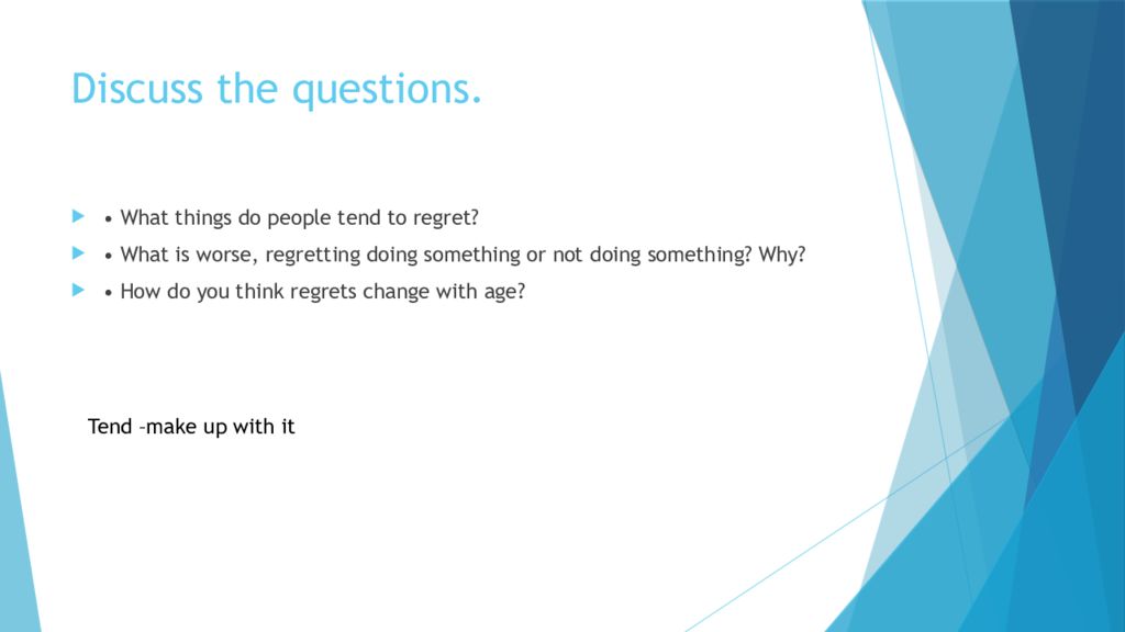 • What things do people tend to regret? • What is worse, regretting doing something or not doing something? Why? • How do you think regrets change with age? Tend –make up with it