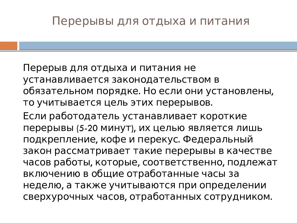 Перерыв для отдыха и питания не устанавливается законодательством в обязательном порядке. Но если они установлены, то учитывается цель этих перерывов. Если работодатель устанавливает короткие перерывы (5-20 минут), их целью является лишь подкрепление, кофе и перекус. Федеральный закон рассматривает такие перерывы в качестве часов работы, которые, соответственно, подлежат включению в общие отработанные часы за неделю, а также учитываются при определении сверхурочных часов, отработанных сотрудником.