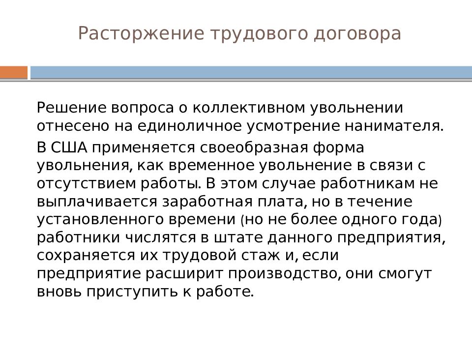 Решение вопроса о коллективном увольнении отнесено на единоличное усмотрение нанимателя. В США применяется своеобразная форма увольнения, как временное увольнение в связи с отсутствием работы. В этом случае работникам не выплачивается заработная плата, но в течение установленного времени (но не более одного года) работники числятся в штате данного предприятия, сохраняется их трудовой стаж и, если предприятие расширит производство, они смогут вновь приступить к работе.