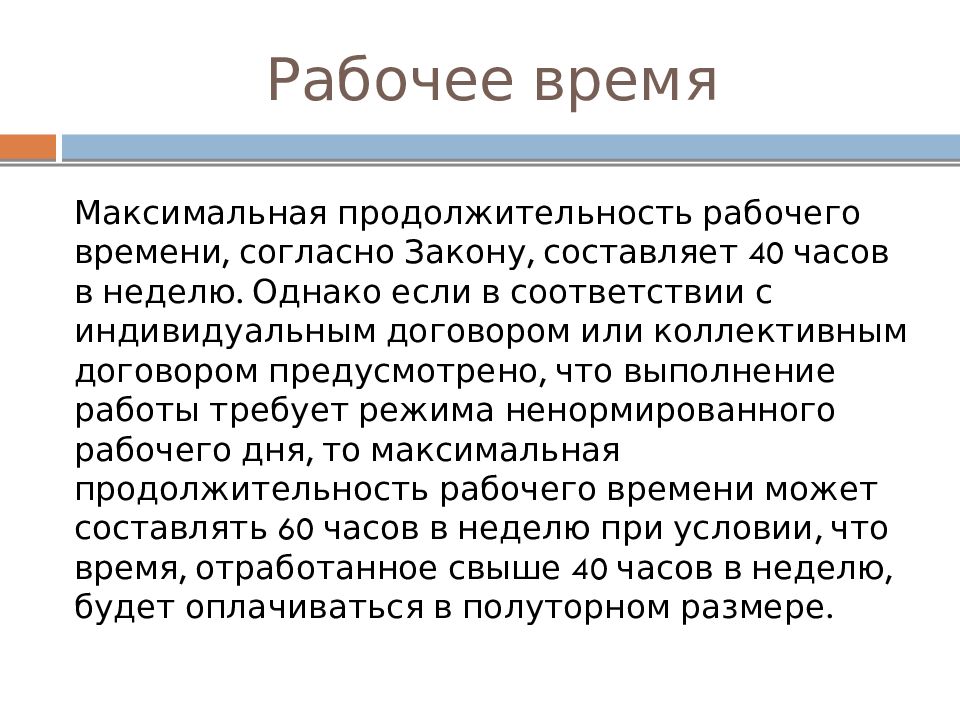 Максимальная продолжительность рабочего времени, согласно Закону, составляет 40 часов в неделю. Однако если в соответствии с индивидуальным договором или коллективным договором предусмотрено, что выполнение работы требует режима ненормированного рабочего дня, то максимальная продолжительность рабочего времени может составлять 60 часов в неделю при условии, что время, отработанное свыше 40 часов в неделю, будет оплачиваться в полуторном размере.