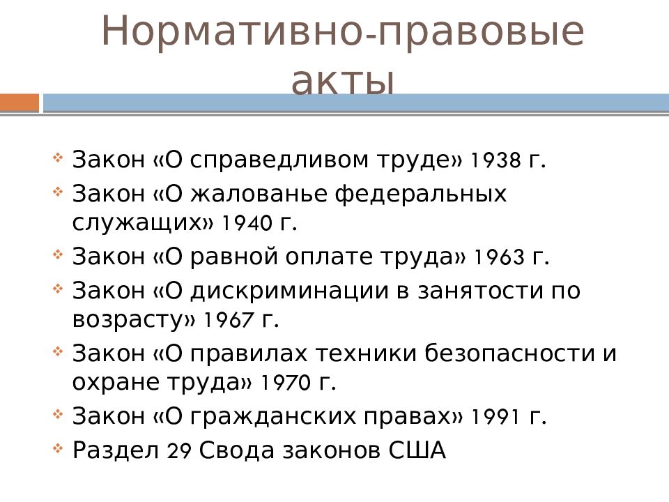 Закон «О справедливом труде» 1938 г. Закон «О жалованье федеральных служащих» 1940 г. Закон «О равной оплате труда» 1963 г. Закон «О дискриминации в занятости по возрасту» 1967 г. Закон «О правилах техники безопасности и охране труда» 1970 г. Закон «О гражданских правах» 1991 г. Раздел 29 Свода законов США