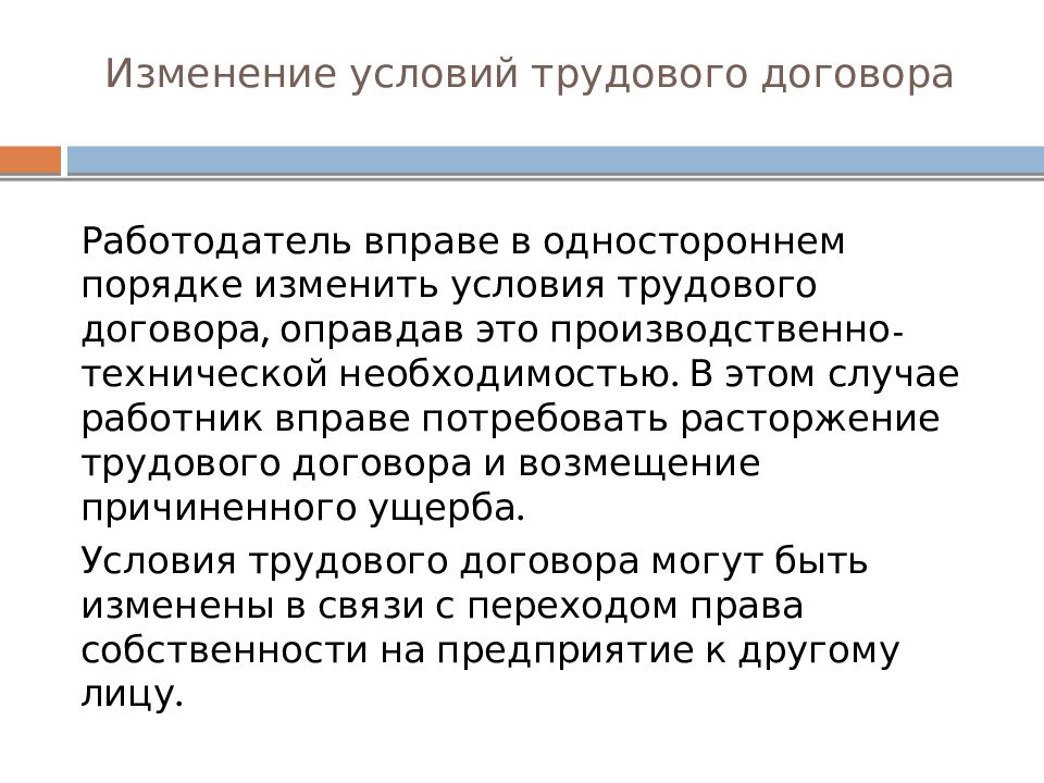 Работодатель вправе в одностороннем порядке изменить условия трудового договора, оправдав это производственно-технической необходимостью. В этом случае работник вправе потребовать расторжение трудового договора и возмещение причиненного ущерба. Условия трудового договора могут быть изменены в связи с переходом права собственности на предприятие к другому лицу.