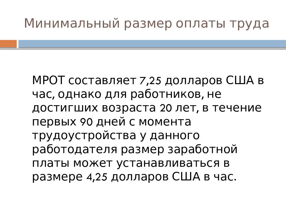 МРОТ составляет 7,25 долларов США в час, однако для работников, не достигших возраста 20 лет, в течение первых 90 дней с момента трудоустройства у данного работодателя размер заработной платы может устанавливаться в размере 4,25 долларов США в час.