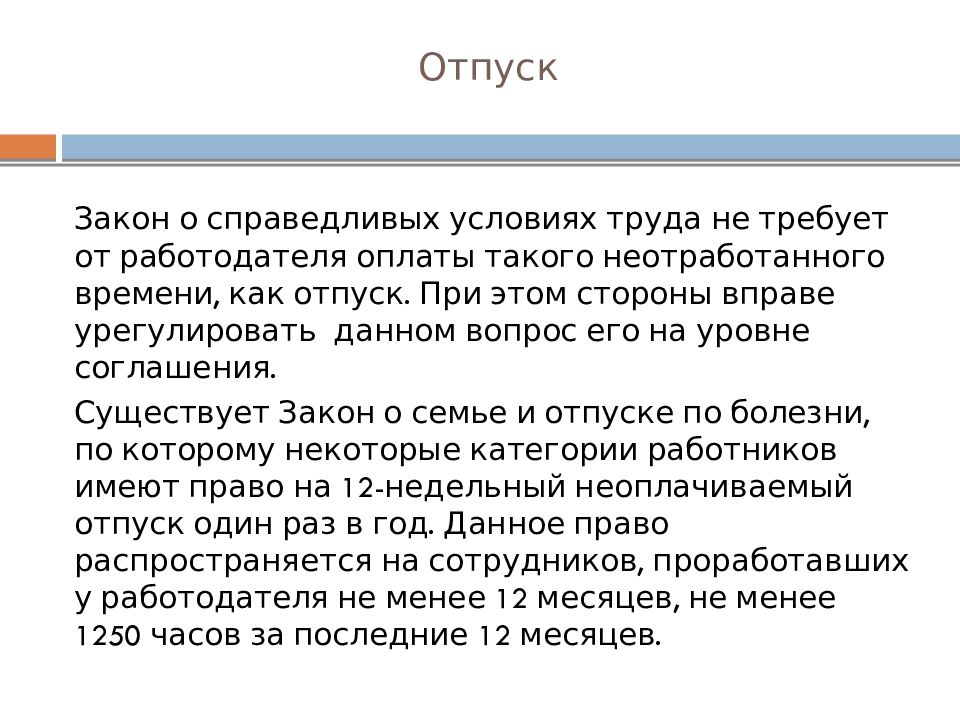 Закон о справедливых условиях труда не требует от работодателя оплаты такого неотработанного времени, как отпуск. При этом стороны вправе урегулировать данном вопрос его на уровне соглашения. Существует Закон о семье и отпуске по болезни, по которому некоторые категории работников имеют право на 12-недельный неоплачиваемый отпуск один раз в год. Данное право распространяется на сотрудников, проработавших у работодателя не менее 12 месяцев, не менее 1250 часов за последние 12 месяцев.