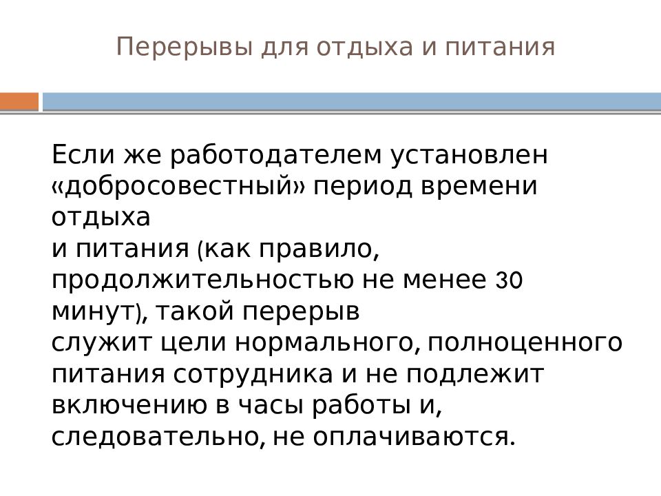 Если же работодателем установлен «добросовестный» период времени отдыха и питания (как правило, продолжительностью не менее 30 минут), такой перерыв служит цели нормального, полноценного питания сотрудника и не подлежит включению в часы работы и, следовательно, не оплачиваются.