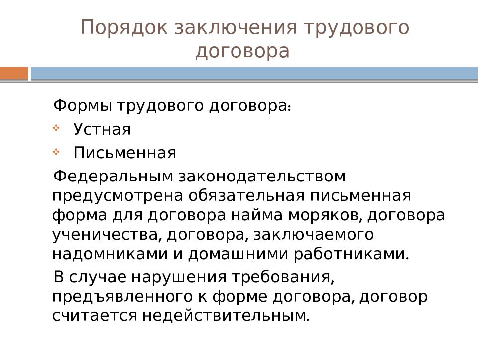 Формы трудового договора: Устная Письменная Федеральным законодательством предусмотрена обязательная письменная форма для договора найма моряков, договора ученичества, договора, заключаемого надомниками и домашними работниками. В случае нарушения требования, предъявленного к форме договора, договор считается недействительным.