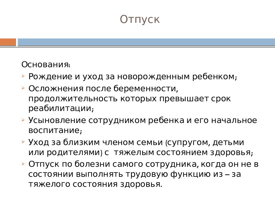 Основания: Рождение и уход за новорожденным ребенком; Осложнения после беременности, продолжительность которых превышает срок реабилитации; Усыновление сотрудником ребенка и его начальное воспитание; Уход за близким членом семьи (супругом, детьми или родителями) с тяжелым состоянием здоровья; Отпуск по болезни самого сотрудника, когда он не в состоянии выполнять трудовую функцию из – за тяжелого состояния здоровья.