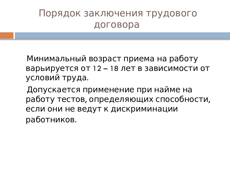 Минимальный возраст приема на работу варьируется от 12 – 18 лет в зависимости от условий труда. Допускается применение при найме на работу тестов, определяющих способности, если они не ведут к дискриминации работников.