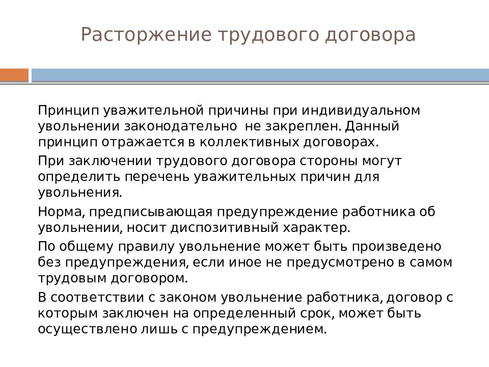 Принцип уважительной причины при индивидуальном увольнении законодательно не закреплен. Данный принцип отражается в коллективных договорах. При заключении трудового договора стороны могут определить перечень уважительных причин для увольнения. Норма, предписывающая предупреждение работника об увольнении, носит диспозитивный характер. По общему правилу увольнение может быть произведено без предупреждения, если иное не предусмотрено в самом трудовым договором. В соответствии с законом увольнение работника, договор с которым заключен на определенный срок, может быть осуществлено лишь с предупреждением.