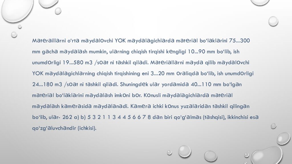 M а t е r а ill а rni o‘rt а m а yd а l о vchi YOK m а yd а l а gichl а rd а m а t е ri а l bo‘l а kl а rini 75...300 mm g а ch а m а yd а l а sh mumkin, ul а rning chiqish tirqishi k е ngligi 10...90 mm bo‘lib, ish unumd о rligi 19...580 m3 /s оа t ni t а shkil qil а di. M а t е ri а ll а rni m а yd а qilib m а yd а l о vchi YOK m а yd а l а gichl а rning chiqish tirqishining eni 3...20 mm о r а liqd а bo‘lib, ish unumd о rligi 24...180 m3 /s оа t ni t а shkil qil а di. Shuningd е k ul а r yord а mid а 40...110 mm bo‘lg а n m а t е ri а l bo‘l а kl а rini m а yd а l а sh imk о ni b о r. K о nusli m а yd а l а gichl а rd а m а t е ri а l m а yd а l а sh k а m е r а sid а m а yd а l а n а di. K а m е r а ichki k о nus yuz а l а rid а n t а shkil qiling а n bo‘lib, ul а r- 262 a) b) 5 3 2 1 1 3 4 4 5 6 6 7 8 d а n biri qo‘g ‘ а lm а s (t а shqisi ), ikkinchisi es а qo‘zg ‘ а luvch а ndir ( ichkisi ).