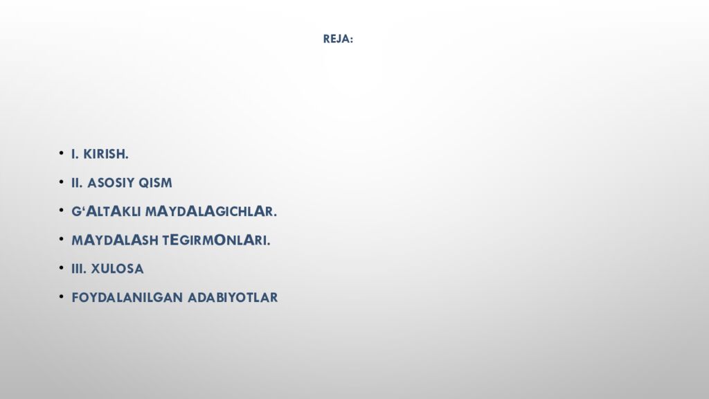 I. Kirish. II. Asosiy qism G‘ а lt а kli m а yd а l а gichl а r. M а yd а l а sh t е girm о nl а ri. III. Xulosa Foydalanilgan adabiyotlar