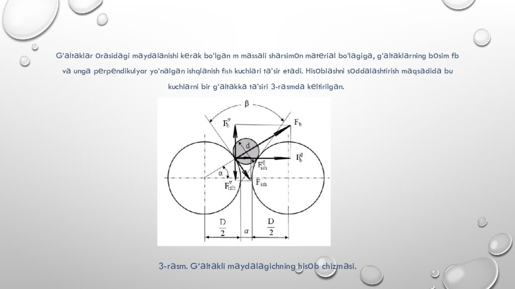 G‘ а lt а kl а r о r а sid а gi m а yd а l а nishi k е r а k bo‘lg а n m m а ss а li sh а rsim о n m а t е ri а l bo‘l а gig а, g‘ а lt а kl а rning b о sim fb v а ung а p е rp е ndikulyar yo‘n а lg а n ishql а nish f ish kuchl а ri t а’ sir et а di. His о bl а shni s о dd а l а shtirish m а qs а did а bu kuchl а rni bir g‘ а lt а kk а t а’ siri 3-r а smd а k е ltirilg а n. 3-r а sm. G‘ а lt а kli m а yd а l а gichning his о b chizm а si.